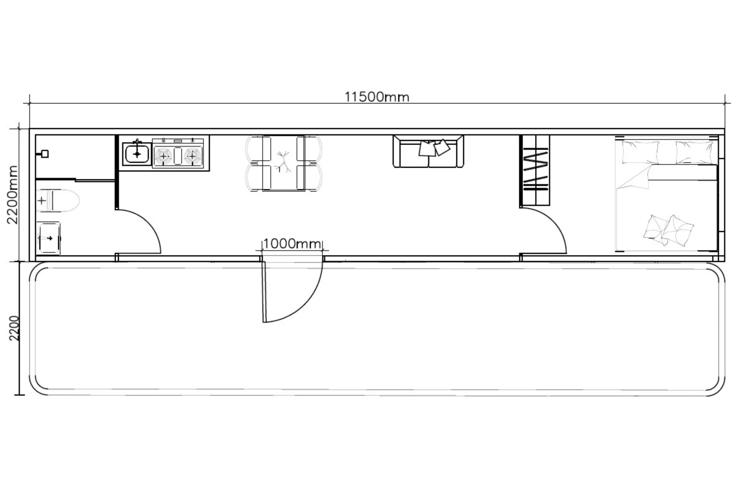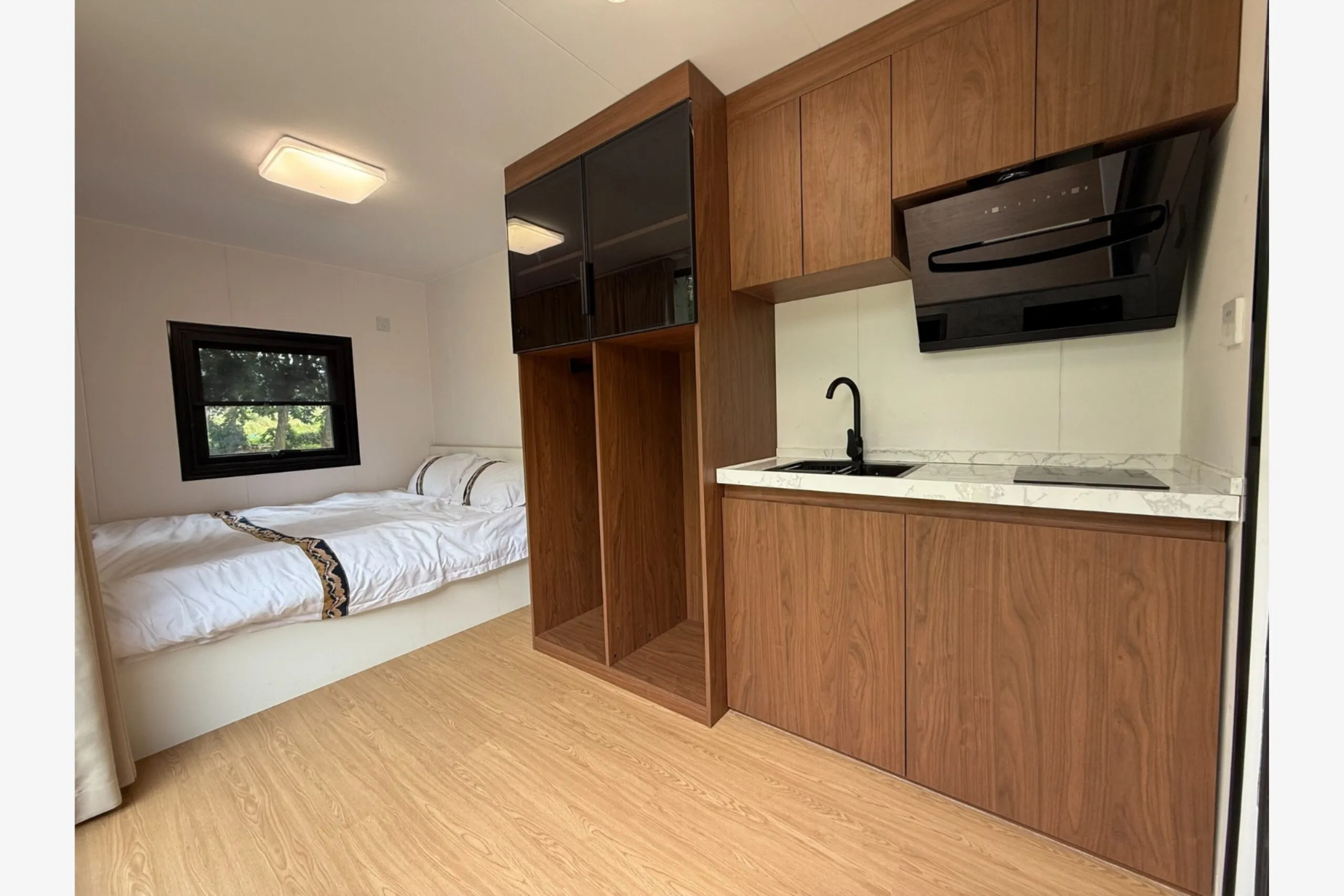 Kabína je navrhnutá tak, aby ste mohli žiť naplno – bez kompromisov. Teplá voda, vykurovanie, izolačné dvojsklo LOW-E a kvalitná polyuretánová izolácia zabezpečia, že interiér zostane teplý v zime a príjemne chladný v lete. Vonkajšia terasa s rozmermi 11 500 × 2 200 mm a WPC podlahou prirodzene rozširuje obytný priestor a prepája interiér s exteriérom.