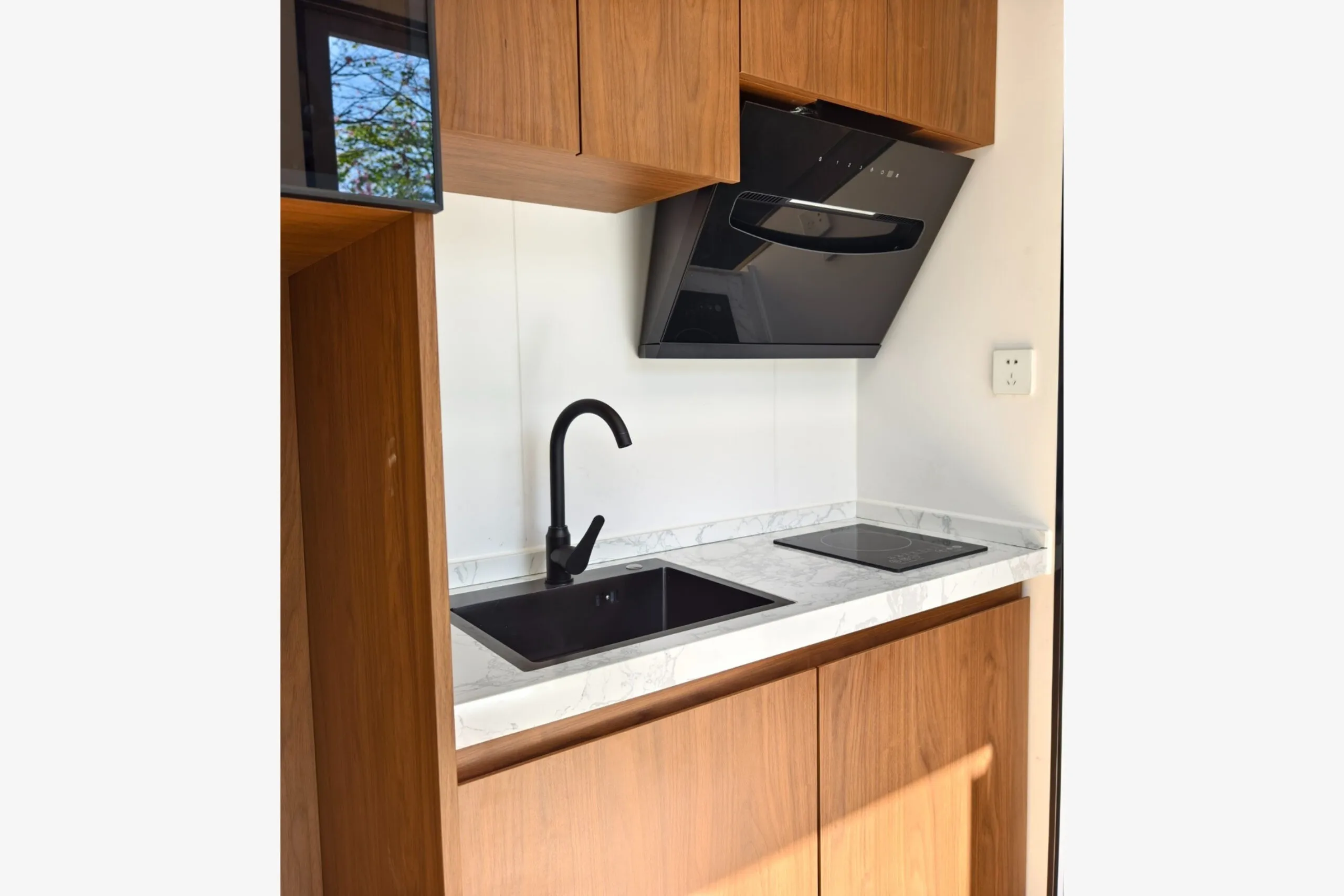 Kuchyňa je navrhnutá ako 3-metrový otvorený priestor s pracovnou doskou z umelého mramoru, ktorá je elegantná a ľahko udržiavateľná. Súčasťou kuchyne sú spodné aj horné skrinky, nerezový drez s batériou a digestor – všetko pre pohodlné každodenné varenie.